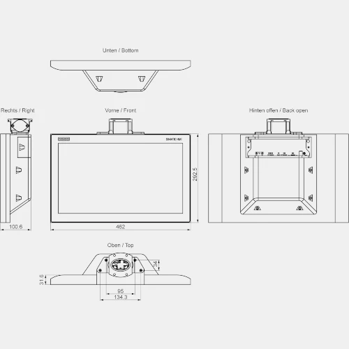 HMI 6AV2128-3UB27-0AX0 z montażem na wysięgniku, bez rozszerzeń charakteryzuje się rozdzielczością 1920x1080 pix. Wyświetlacz w tym HMI Siemens ma wymiar 409x230.