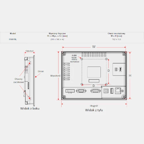 Panel HMI IT6070E-INT renomowanego producenta Inovance został wyposażony w dotykowy ekran rezystancyjny 4-przewodowy LCD o przekątnej 7". Dodatkowo dysponuje 24-bitową paletą kolorów o rozdzielczości 800 x 480 pix. Żywotność ekranu producent podaje na 35000 godzin. Panel IT6070E-INT ma wbudowane liczne porty komunikacyjne, mowa tu o porcie COM1 (RS422/RS485), COM2 (RS232), COM3 (RS485) oraz Ethernet. Ponadto Inovance wyposażył panel w wejście USB Host oraz Device, a co istotne także zegar czasu rzeczywistego RTC. Panel HMI Inovance posiada również makro kody, które pozwalają w bardzo intuicyjny sposób wdrożyć złożone funkcje. Panel Inovance zawiera także funkcjonalność SCADA. IT6070E-INT dysponuje pamięcią Flash 128MB oraz pamięcią receptur 128 MB. Interfejs HMI pracuje na procesorze Cortex A8 600Mhz i zasilany jest napięciem 24 VDC o poborze prądu 250mA. HMI IT6070E-INT wykonany od frontu o wysokiej klasie odporności IP65 z możliwością pracy w temperaturze od 0...50 stopni Celsjusza. Oprogramowanie dedykowane do panelu nosi nazwę InoTouch Editor i jest zupełnie darmowe. Panel HMI IT6070E-INT Inovance o wymiarach 200 x 146 x 35 mm i wymiarach montażowych 192 x 138 mm.
