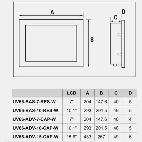 Panel HMI UV66-ADV-10-CAP-W producenta Weidmuller serii Advanced zasilany jest napięciem 24V DC i pobiera prąd w wysokości 0,54 A. Panel Weidmuller posiada pojemnością matryce MultiTouch o przekątnej 10,1 cala, a ponadto zawiera 16M kolorów. Panel operatorski UV66-ADV-10-CAP-W dysponuje szybkim procesorem ARM Cortex A9 1 GHz NXP® i.MX6 DualLite z systemem operacyjnym Linux wraz z przeglądarką HTML5. Dodatkowo posiada pamięć Flash 4GB oraz 1 GB pamięci RAM. Atutem panelu HMI Advanced Weidmuller jest wbudowany port Ethernet ze złączem RJ45 oraz gniazdo USB 2.0 typu B. Panel HMI Weidmuller zaprojektowany został w obudowie z tworzywa sztucznego o stopniu ochrony IP66 od frontu i wymiarach 201,5 x 293 x 48 mm. Z kolei wagę produktu UV66-ADV-10-CAP-W Advanced producent podaje na 2,35 kg. UV66-ADV-10-CAP-W został przystosowany do pracy w temperaturze od 0...50 stopni Celsjusza.