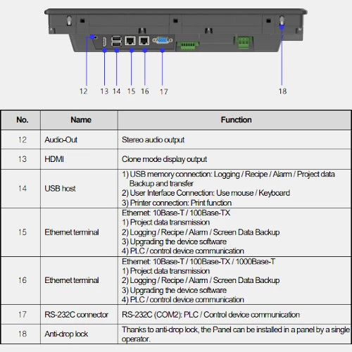 Panel HMI eXP2-1000Dserii eXP2 producenta LS o zasilaniu 24 V DC i mocy 6 W. Wyposażony został w dotykową 4-rdzeniową matryce TFT o przekątnej 10,2” i rozdzielczości 1024x600 pikseli. Szybkie i płynne poruszanie się zapewnia procesor 800 MHz. Żywotność panelu operatorskiego LG podaje do 30 000 godzin. Panel HMI eXP2 LG ma wbudowane liczne porty komunikacyjne RS232, RS422/485, Ethernet, wejście USB 2.0 oraz zegar czasu rzeczywistego RTC z podtrzymaniem bateryjnym. Dodatkowo ten model posiada 1 złącze USB drive. Dysponuje pamięcią 64 MB oraz 512 MB RAM. Panel operatorski HMI eXP2-1000D o stopniu ochrony IP65 może pracować w temperaturze od 0...50 stopni Celsjusza. Wymiary panelu eXP2-1000DeXP2 LG wynoszą 218 x 276 x 35,1 mm. Natomiast wymiary montażowe 202 x 260 mm i waży 1 kg. Panel HMI eXP2-1000D eXP2 LG jest posiadaczem licznych certyfikatów CE, UL oraz KC.