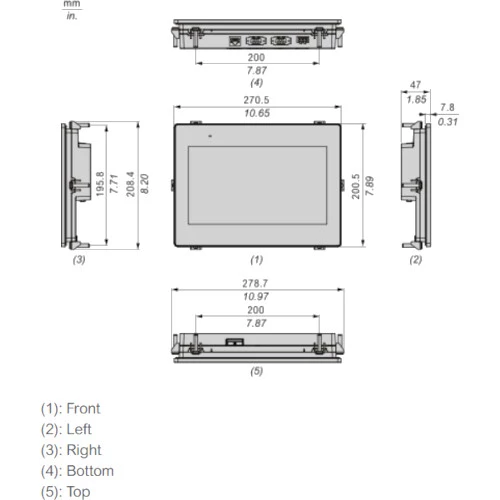 HMI Schneider HMIET6501 został wyposażony w obudowę o wymiarach: 271x201x47 mm, jego waga szacowana jest na 0,99 kg. Wymiary otworu montażowego dla tego modelu wynoszą: 255x185mm.