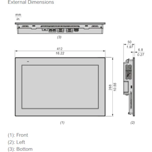 HMI Schneider HMIET6700 został wyposażony w obudowę o wymiarach: 268x412x50 mm, jego waga szacowana jest na 2,52 kg. Wymiary otworu montażowego dla tego modelu wynoszą: 394x250mm.