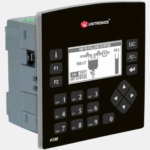 HMI V130-J-B1 o przekątnej 2,4" producenta Unitronics serii V130-J zasilany jest napięciem 24V DC. Panel modułowy został wyposażony wyświetlacz graficznym o rozdzielczości 128 x 64 pixela. Panel mono V130-J-B1 z zabudowanym sterownikiem PLC o pamięci drabinki 448k. Dodatkowo panel HMI ma możliwość łączenia w sieci Modbus Master/Slawe przy pomocy portów szeregowych RS232/RS485. Modułowypanel mono UnitronicsV130-J-B1 został wyposażony w 20 klawiszy funkcyjnych oraz gniazdo SD. Producent deklaruje żywotność urządzenia na 7 lat przy pracy w 25 stopniach C. V130-J-B1 Unitronics zaprojektowany z możliwością pracy w temperaturze od 0...50 stopni Celsjusza. HMI Vision B1 V130-J-B1 posiada obudowę o stopniu ochrony IP65 od frontu i wymiarach: 109 x 114 x 66 mm. Waga urządzenia to 255 gram.