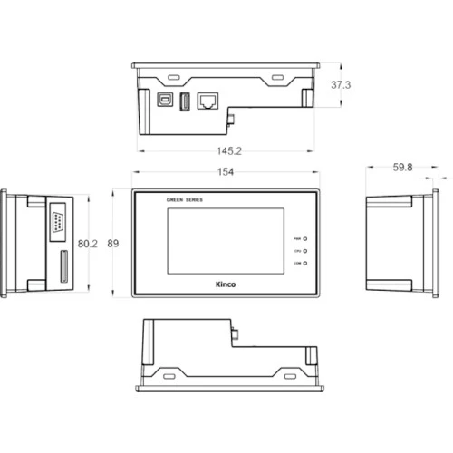 Pulpit GH043 o przekątnej 4,3" i rozdzielczości 480x272 pikseli. Panel HMI zasilany jest napięciem 24 VDC. Ponadto panel Kinco Green ma wydajny procesor ARM RISC 32bit. GH043 posiada 128 MB pamięci RAM. Urządzenie Kinco ma wbudowany porty: Ethernet, USB, RS232, RS422, RS485. Wymiary to: 154 x 89 x 60 mm. Waga panela jest równa 0,4 kg. Kinco deklaruje żywotność HMI do 30000 godzin.