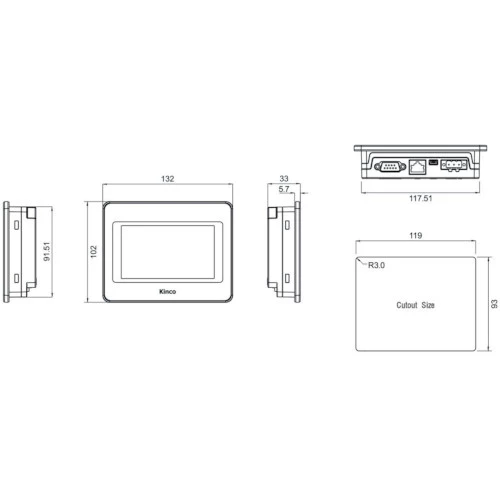Panel operatorski HMI MT4230TE producenta Kinco o mocy 2,4W zasilany jest napięciem 24V DC. HMI został wyposażony w dotykową matrycę TFT o przekątnej ekranu 4,3 i rozdzielczości 480x272 pix. Ponadto panel HMI MT4000 Kinco dysponuje bogatą ilością kolorów 65536 wraz z podświetleniem LED o żywotności do 5000 h i jasności 250 cd/m2. Panel dotykowy MT4230TE pracuje w oparciu o wydajny procesor 32-bit RISC 800 MHz. Producent zastosował w urządzeniu szereg funkcjonalności takich jak: gniazdo USB, port Ethernet, RS232, RS485 oraz zegar czasu rzeczywistego RTC. HMI Kinco wykonany został w wymiarach 102 x 132 x 33 mm i wadze 0,21 kg. Natomiast otwór montażowy dla MT4230TE wynosi 119x93 mm. Producent przystosował panel HMI do pracy w temperaturze 0...50°C. Konfiguracja MT4230TE odbywa się za pomocą darmowego narzędzia HMIware.