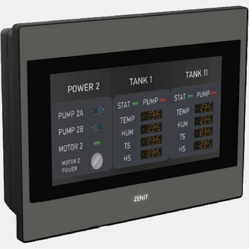 HMI P5 Fatek zaprojektowany jest do pracy w temperaturze oscylującej w przedziale 0...50 stopni Celsjusza. Obudowa panelu P5043SB została wykonana z najwyższej jakości PCV o stopniu ochrony IP65 od frontu oraz IP20 obudowy tylnej. Panele HMI Fatek P5 B posiadają dwukolorową obudowę z logo Zenit. Port główny oraz zasilanie w HMI P5043SB umieszczone są na dole.