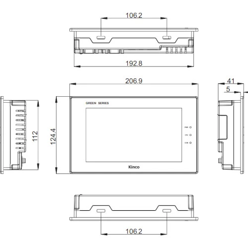 Pulpit GH070E o przekątnej 7" i rozdzielczości 800x480 pikseli. Panel HMI zasilany jest napięciem 24 VDC. Ponadto panel Kinco Green ma wydajny procesor ARM RISC 32bit. GH070E posiada 128 MB pamięci RAM. Urządzenie Kinco ma wbudowany porty: Ethernet, USB, RS232, RS422, RS485. Wymiary to: 207 x 125 x 46 mm. Waga panela jest równa 0,6 kg. Kinco deklaruje żywotność HMI do 30000 godzin.