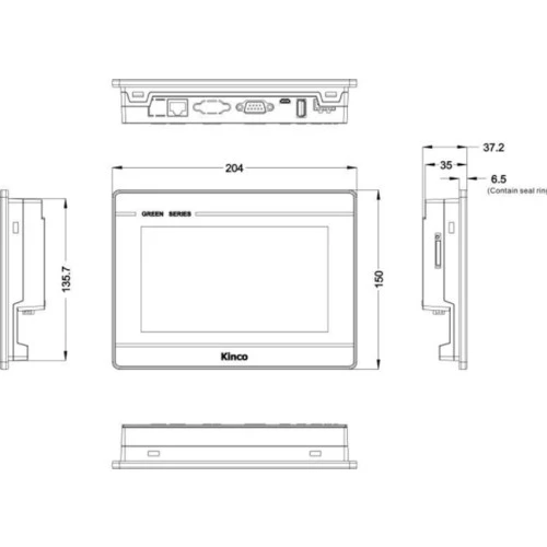 Pulpit GL070 o przekątnej 7" i rozdzielczości 800x480 pikseli. Panel HMI zasilany jest napięciem 24 VDC. Ponadto panel Kinco Green ma wydajny procesor ARM RISC 32bit. GL070 posiada 128 MB pamięci RAM. Urządzenie Kinco ma wbudowany porty: Ethernet, USB, RS232, RS422, RS485. Wymiary to: 204 x 150 x 34 mm. Waga panela jest równa 0,5 kg. Kinco deklaruje żywotność HMI do 30000 godzin.