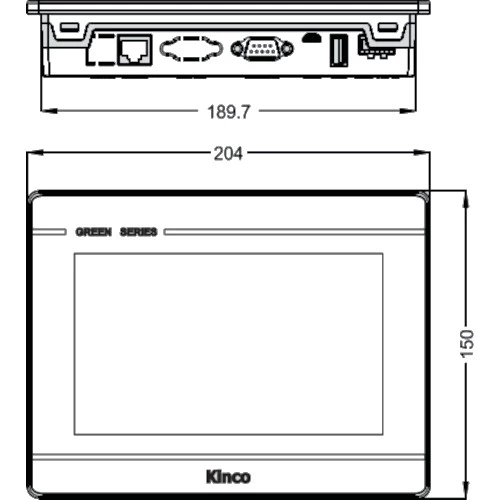 Pulpit GL070E o przekątnej 7" i rozdzielczości 800x480 pikseli. Panel HMI zasilany jest napięciem 24 VDC. Ponadto panel Kinco Green ma wydajny procesor ARM RISC 32bit. GL070E posiada 128 MB pamięci RAM. Urządzenie Kinco ma wbudowany porty: Ethernet, USB, RS232, RS422, RS485. Wymiary to: 204 x 150 x 34 mm. Waga panela jest równa 0,5 kg. Kinco deklaruje żywotność HMI do 30000 godzin.