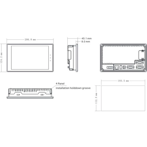 Panel operatorski HMI MT4404T producenta Kinco o mocy 8W zasilany jest napięciem 24V DC. HMI został wyposażony w dotykową matrycę TFT o przekątnej ekranu 7 i rozdzielczości 800x480. Ponadto panel HMI MT4000 Kinco dysponuje bogatą ilością kolorów 65536 wraz z podświetleniem LED o żywotności do 5000 h i jasności 300 cd/m2. Panel dotykowy MT4404T pracuje w oparciu o wydajny procesor 32-bit RISC CPU 400 MHz. Producent zastosował w urządzeniu szereg funkcjonalności takich jak: gniazdo USB, port Ethernet, RS232, RS485 oraz zegar czasu rzeczywistego RTC. HMI Kinco wykonany został w wymiarach 124,2 x 206,8 x 45,1 mm i wadze 0,7. Natomiast otwór montażowy dla MT4404T wynosi 193,5x112,5 mm. Producent przystosował panel HMI do pracy w temperaturze -10...55°C. Konfiguracja MT4404T odbywa się za pomocą darmowego narzędzia HMIware.
