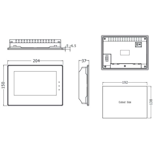 Panel operatorski HMI MT4414TE producenta Kinco o mocy 8W zasilany jest napięciem 24V DC. HMI został wyposażony w dotykową matrycę TFT o przekątnej ekranu 7 i rozdzielczości 800x480. Ponadto panel HMI MT4000 Kinco dysponuje bogatą ilością kolorów 65536 wraz z podświetleniem LED o żywotności do 5000 h i jasności 300 cd/m2. Panel dotykowy MT4414TE pracuje w oparciu o wydajny procesor 32-bit RISC CPU 800 MHz. Producent zastosował w urządzeniu szereg funkcjonalności takich jak: gniazdo USB, port Ethernet, RS232, RS485 oraz zegar czasu rzeczywistego RTC. HMI Kinco wykonany został w wymiarach 124,2 x 206,8 x 45,1 mm i wadze 0,7. Natomiast otwór montażowy dla MT4414TE wynosi 193,5x112,5 mm. Producent przystosował panel HMI do pracy w temperaturze 0...50°C. Konfiguracja MT4414TE odbywa się za pomocą darmowego narzędzia HMIware.