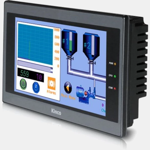 Panel operatorski HMI MT4424T producenta Kinco o mocy 8W zasilany jest napięciem 24V DC. HMI został wyposażony w dotykową matrycę TFT o przekątnej ekranu 7 i rozdzielczości 800x480. Ponadto panel HMI MT4000 Kinco dysponuje bogatą ilością kolorów 65536 wraz z podświetleniem LED o żywotności do 5000 h i jasności 300 cd/m2. Panel dotykowy MT4424T pracuje w oparciu o wydajny procesor 32-bit RISC CPU 624 MHz. Producent zastosował w urządzeniu szereg funkcjonalności takich jak: gniazdo USB, port RS232, RS485 oraz zegar czasu rzeczywistego RTC. HMI Kinco wykonany został w wymiarach 124,2 x 206,8 x 45,1 mm i wadze 0,8. Natomiast otwór montażowy dla MT4424T wynosi 193,5x112,5 mm. Producent przystosował panel HMI do pracy w temperaturze 0...45°C. Konfiguracja MT4424T odbywa się za pomocą darmowego narzędzia HMIware.