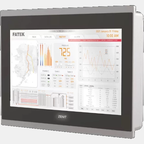 Panel HMI U7070NA Fatek z wyświetlaczem TFT o przekątnej 7". Panel charakteryzuje się szerokim kątem widzenia. Producent wyposażył HMI U7070NA w podświetlenie LED 500cd/m2 oraz wydajny 32 bitowy procesor. 7" panel Fatek dysponuje portem szeregowym SR232, RS4985, RS422, portem Ethernet, USB typu A oraz USB typu C. Producent deklaruje pamięć urządzenia na poziomie 4GB FLASH oraz 1 GB RAM.