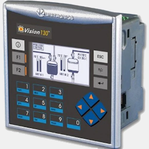 HMI V130-33-TA24 producenta Unitronics serii V130 zasilany jest napięciem 24V DC. Panel modułowy został wyposażony w 12 wejścia cyfrowe w tym 1 szybkie, 2 wejścia analogowe 0...10V, 0...20/4...20mA, 2 wyjścia temperaturowe, 10 wyjść tranzystorowych PNP w tym 5 szybkich oraz 2 wyjścia analogowe prądowo-napięciowe. Ponadto HM IV130-33-TA24 z PLC dysponuje portem RS232, RS485 oraz slotem na karty SD. Panel został wyposażony w sterownik PLC z pamięcią programu 448K. Modułowy panel V130-33-TA24 posiada jednoliniowy wyświetlacz z 16 znakami oraz 20 funkcyjnych klawiszy. V130-33-TA24 Unitronics zaprojektowany z możliwością pracy w temperaturze od 0...50 stopni Celsjusza. Panel HMI mono z PLC Unitronics V130 przystosowany jest do montażu na szynie DIN.