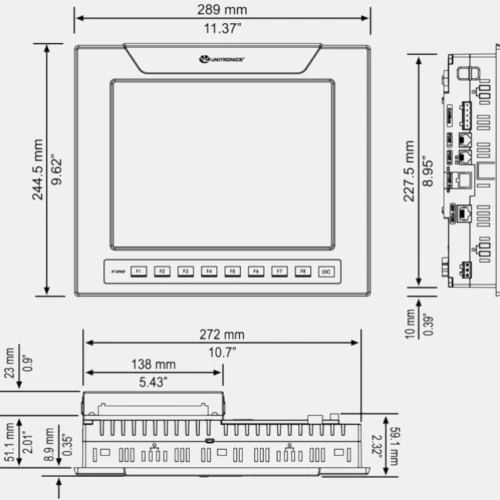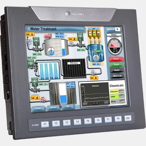 Panel operatorski HMI V1040-T20B producenta Unitronics o przekątnej ekranu 10,4". Dotykowy ekran TFT LCD o rozdzielczości 800x600 pix posiada ponad 65M kolorów. Dodatkowo panel Vision HMI posiada 9 klawiszy funkcyjnych. Panel HMI Vision z wbudowanym sterownikiem PLC zasilany jest napięciem 24V DC i pobiera prąd w wysokości 4,2A. Kolorowy panel HMI UnitronicsV1040-T20B został wyposażony w slot na karty SD, port RS232, RS485 z komunikacją CANbus. V1040-T20B Vision1xxx został wykonany w wymiarach 244,5 x 289 x 59,1 mm i wadze 1,5 kg. Stopień ochrony obudowy producent deklaruje na IP65 od frontu, a ponadto przewiduje żywotność baterii do 7 lat przy pracy w temperaturze 25 stopni Celsjusza.