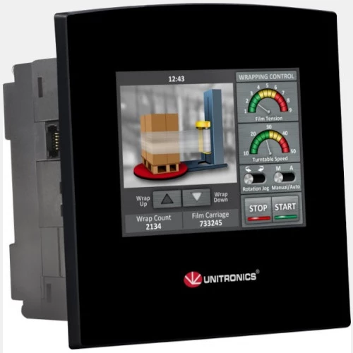 Panel operatorski HMI SM35-J-R20 producenta Unitronics o przekątnej ekranu 3,5". Dotykowy ekran TFT LCD o rozdzielczości 320x240 pix posiada ponad 65M kolorów. Dodatkowo graficzny panel HMI dysponuje 12 wejściami binarnymi, 2 analogowymi 0...10V lub 0/4...20mA oraz 8 wyjściami przekaźnikowymi. Panel HMI SAMBA posiada wbudowany sterownik PLC, zasilany jest napięciem 24V DC i pobiera prąd w wysokości 0,195 A. Kolorowy panel HMI UnitronicsSM35-J-R20 został wyposażony w slot na karty SD, port RS232, RS485 z komunikacją CANbus. SM35-J-R20 SAMBA został wykonany w wymiarach 109 x 114,1 x 68 mm i wadze 0,21 kg. Stopień ochrony obudowy producent deklaruje na IP65 od frontu, a ponadto przewiduje żywotność baterii do 7 lat przy pracy w temperaturze 25 stopni Celsjusza.