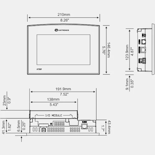 Panel operatorski HMI V700-T20BJ producenta Unitronics o przekątnej ekranu 7". Dotykowy ekran TFT LCD o rozdzielczości 800x480 pix posiada ponad 65M kolorów. Panel HMI Vision z wbudowanym sterownikiem PLC zasilany jest napięciem 12/24V DC i pobiera prąd w wysokości 0,32 A. Kolorowy panel HMI UnitronicsV700-T20BJ został wyposażony w slot na karty SD, port RS232, RS485 z komunikacją CANbus. V700-T20BJ Vision 700 został wykonany w wymiarach 146,4 x 210 x 42,3 mm i wadze 0,64 kg. Stopień ochrony obudowy producent deklaruje na IP66 od frontu, a ponadto przewiduje żywotność baterii do 7 lat przy pracy w temperaturze 25 stopni Celsjusza.