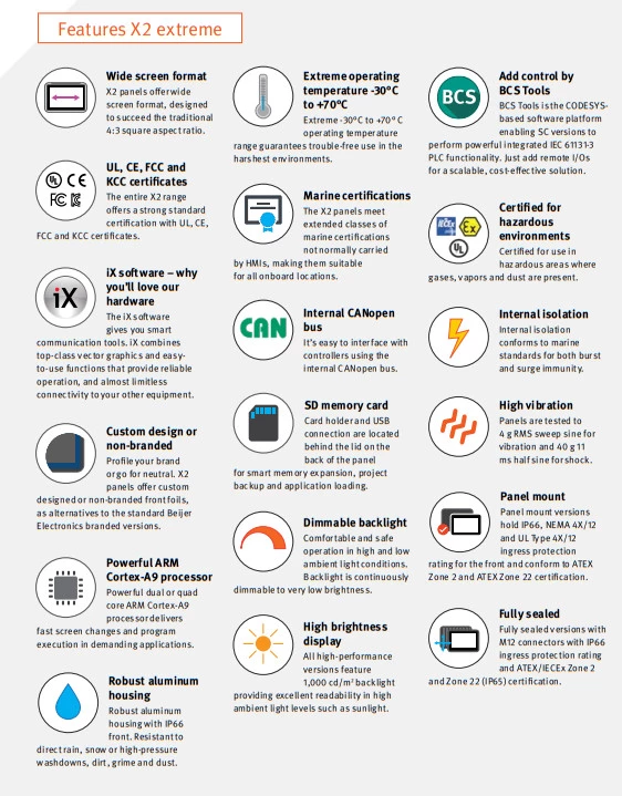 Panele HMI X2 Extreme Beijer dedykowane są do pracy w trudnych warunkach przemysłowych. Urządzenie te zostały zaprojektowane z myślą o pracy z narażeniem na działanie gazów, oparów czy pyłów. Dzięki możliwości pracy od -30 do +70 stopni Celsjusza mogą być wykorzystywane w aplikacjach zewnętrznych. Dodatkowo Beijer zapewnia możliwość czyszczenia paneli X2 Extreme pod wysokim ciśnieniem. W ofercie dostępne są HMI XX2 Extreme w 3 wielkościach, o przekątnej ekranu: 7", 12" oraz 15,4". Dodatkowo dostępne są HMI o napięciu zasilania 12VDC czy obsługujące CODESYS. Oprócz wykonania standardowego Beijer oferuje swoim klientom dotykowe HMI X2 Extreme o podwyższonej wydajności.