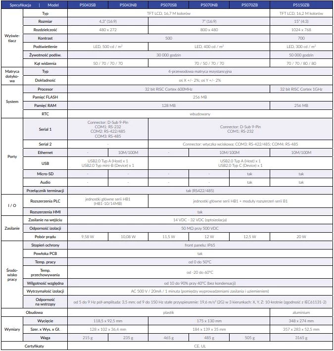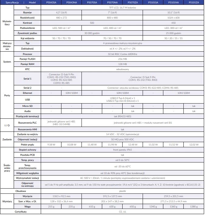 Fatek oferuje panele operatorskie o przekątnej ekranu 4,3”. 7” oraz 10,1”. Wszystkie panele zostały wyposażone w 4-przewodową matrycę rezystancyjną. Wyświetlacz TFT LCD z 16,7 m kolorów. W standardzie panele posiadają zegar czasu rzeczywistego RTC, złącze USB, RS232, RS485 oraz RS422. Natomiast w zależności od modelu dodatkowo mogą posiadać port Ethernet, slot kart micro-SD, oraz port audio. HMI Fatek mogą bezpiecznie pracować w zakresie temperatur od 0 do 50 stopni Celsjusza. Temperatura przechowywania dla paneli wynosi od -20 do +60 stopni C. Od frontu panele posiadają stopień ochrony IP65, natomiast od tyłu IP20. Fatek zadbał o certyfikaty CE oraz UL.