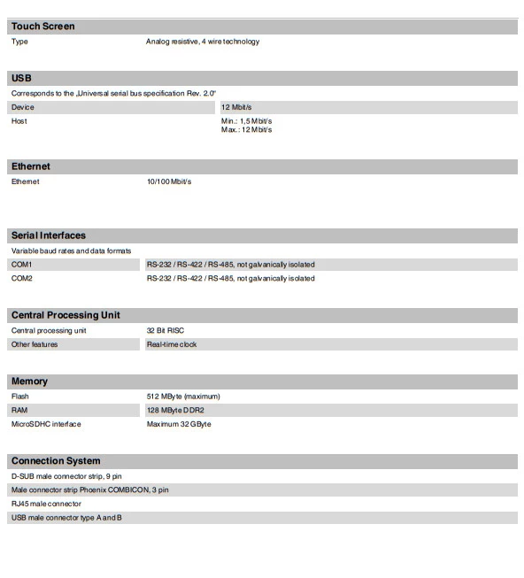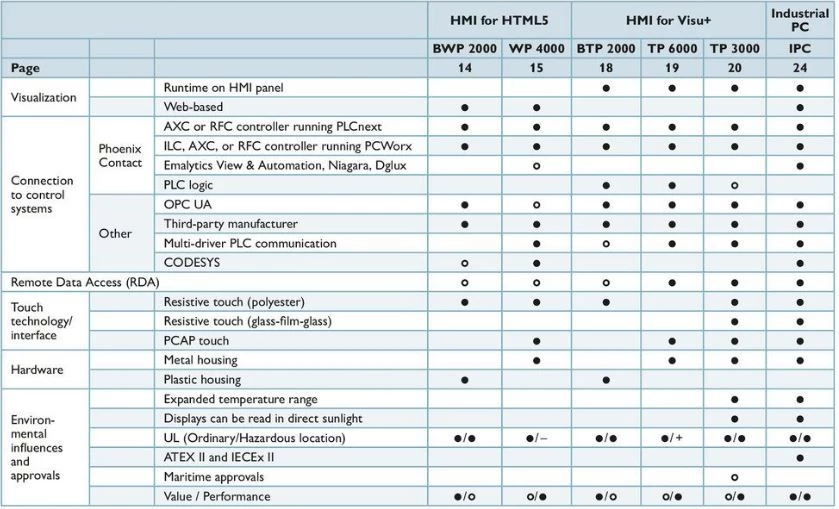 Panele HMI Phoenixcontact dedykowane do aplikacji przemysłowych. W ofercie panele operatorskie o przekątnej ekranu od 3,5" do 21,5". Urządzenia zostały wyposażone w system operacyjny Linux embedded. Transmisja danych jest chroniona kodem SSL. Panele HMI Phoenixcontact zostały wyposażone w szereg protokołów komunikacyjnych dzieki czemu współpracują z wieloma systemami sterowania