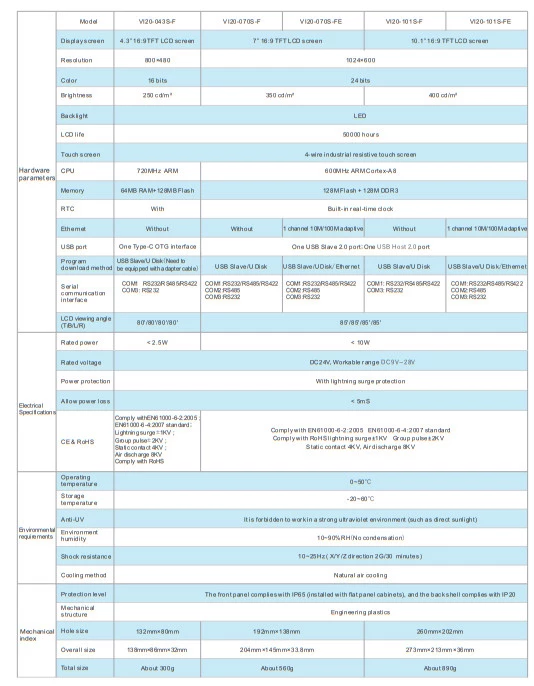 Panele dotykowe serii VI20 wyświetlacz LCD z podświetleniem LED. Producent wyposażył panele w rezystancyjną 4-przewodową matrycę dotykową oraz procesor 600MHz ARM Cortex-A8. W standardzie wszystkie modele posiadają porty szeregowe oraz port USB, dodatkowo producent udostępnia modele z Portem Ethernet oraz slotem na karty SD. W ofercie dostępne są panele HMI w 4 wielkościach, o przekątnej ekranu: