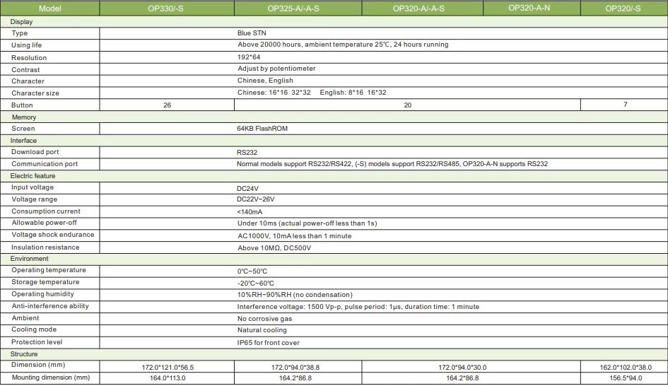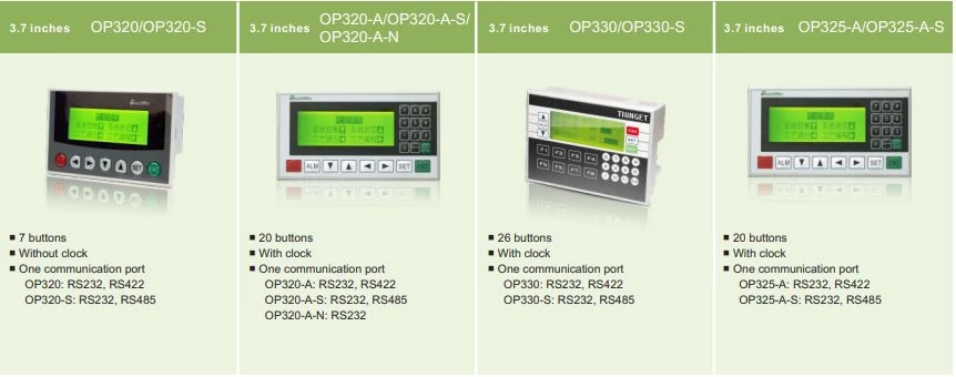 Panele HMI OP Xinje dedykowane do prostych aplikacji. W ofercie znajdują się HMI OP z ekranami kolorowymi lub monochromatycznymi. W ofercie dostępne są panele z ekranem 3,7" oraz 5,7". Urządzenia zasilane są napięciem 24V DC. W standardzie te urządzenie zostały wyposażone w porty szeregowe RS232, RS422 oraz RS485 a także komunikację Modbus. Tekstowe panele Xinje dysponują 64 kB pamięci. Ponadto producent wyposażył panele operatorskie OP w przyciski funkcyjne. W zależności od modelu panel dysponuje 7, 20, 26 lub 42 przyciskami. Przy pomocy zabudowanej klawiatury operator mam możliwość między innymi na wprowadzanie nastaw procesowych oraz danych liczbowych. Kolejną zaletą podstawowych paneli z serii OP jest możliwość wyświetlania zarówno komunikatów tekstowych jak i grafik. HMI OP XINJE zostały wyposażone w obudowę z tworzywa zapewniającą IP65 od frontu. Producent deklaruje możliwość pracy HMI Xinje w temperaturze 0 - 50 stopni Celsjusza.