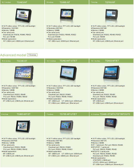 Panele HMI TG/MTG dostępne są w wielkościach od 4,3" do 15,6". W standardzie producent wyposażył panele HMI TG oraz MTG w porty szeregowe RS232, RS422 oraz RS485. Komunikacja odbywa się po protokole Modbus RTU/Modbus TCP. Zapewnia to swobodną komunikację miedzy innymi ze sterownikami Siemens, Mitsubishi, Omron czy Delta Electronics. Kolejna zaletą jest bogata biblioteka elementów graficznych, a także możliwość obsługi animacji. Panele HMI MTG Xinje zostały wyposażone w port USB oraz Micro-USB. Dodatkowo w tych urządzeniach został zainstalowany port PLC. W standardzie HMI z tej serii posiadają wyświetlacz LCD obsługujący 16,77 milionów kolorów. HMI MTG Xinje dysponują 128 MB pamięci. Panele operatorskie TG Xinje dostępne są w wykonaniu z portem Ethernet oraz możliwością podłączenia modułów rozszerzeń.