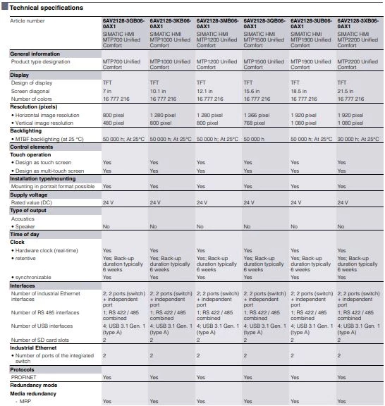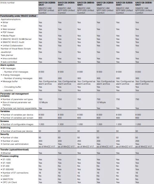 Specyfikacja techniczna paneli HMI Comfort Siemens