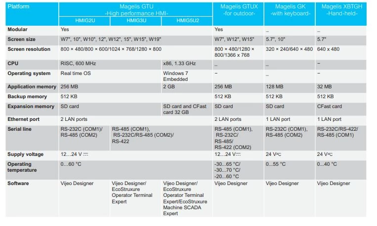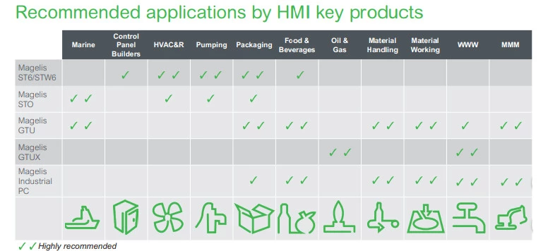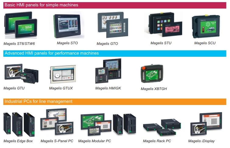 Panele graficzne dostępne są o przekątnych ekranu od 4" do 15". Wysokiej jakości ekrany dysponują wytrzymałością do 1.000.000 dotknięć oraz ponad 50.000 godzinom podświetlenia LED. Panele HMI Schneider Electric mają możliwość dostępu do wszystkich serwerów HTML5 w wersji Basic Web HMI czy Harmony STW6. Dotykowe panele Schneider Electric spełniają wymagania nieskomplikowanych maszyn, zapewniając przy tym wysokiej jakości wizualizację. Panele konfigurowane są poprzez oprogramowanie EcoStructure Operator terminal Expert, z funkcjami multi-screen i Layout Objects (Dock Panel). Zezwalającymi na umieszczenie większej ilości informacji na jednym ekranie.