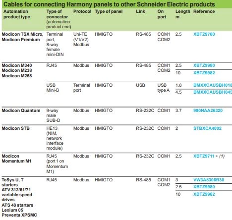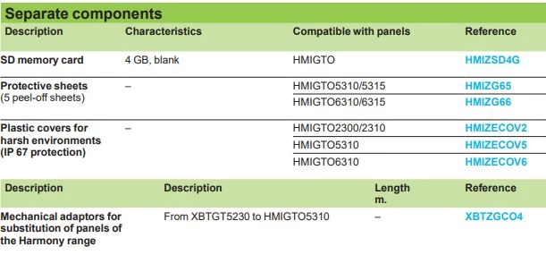 Schneider Electric oprócz paneli HMI w swojej ofercie posiada także szereg dedykowanych akcesoriów. Dostępne są między innymi przewody komunikacyjne, przewody do programowania, adaptery. Producent oferuje także osłony ekranu, uszczelki, karty pamięci.