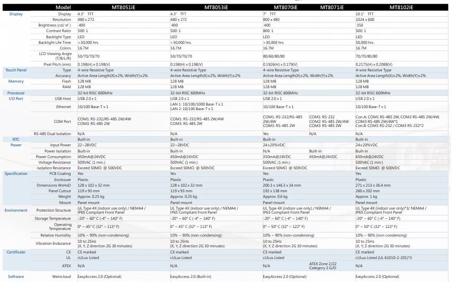 HMI iE to panele operatorskie Weintek o bardzo dużej możliwości zastosowania. Posiadają wejście USB umożliwiające załadowanie programu z dysku FlashUSB, lub działające jako urządzenie peryferyjne (dodatkowa pamięć). Panele dotykowe iE posiadają również wysokiej klasy procesor 32bit Cortex A8 CPU 600 MHz. Urządzenia zastąpiły bardzo popularną rodzinę paneli HMI Weintek iH. Panele HMI Weintek to trzy wielkości ekranów najczęściej wykorzystywanych w automatyce. Występują modele, które mają wbudowaną usługę EasyAcces2.0, w pozostałych modelach istnieje jedynie możliwość jej nabycia. Dodatkowo dostępny jest model 7” Open frame, dedykowany do montażu od wewnętrznej strony szafy.