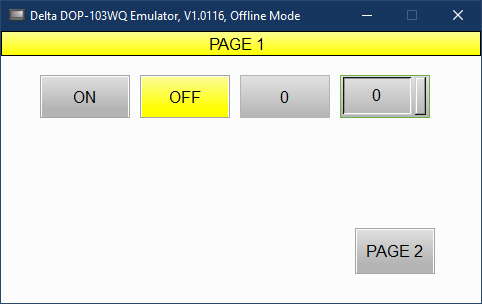 Przygotowany projekt kompilujemy i uruchamiamy w trybie Off-Line. Aby tego dokonać używamy wstążki "Project" i najpierw przycisku [Compile] a następnie, jeśli kompilacja przebiegła bez błędów, użyć przycisku "On-Line Simulation". Po uruchomieniu się symulatora zobaczymy okno podobne do tego z obrazka poniżej.