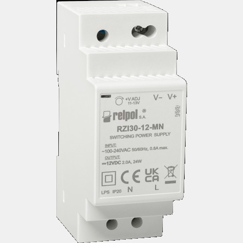 Moduł zasilający RZI30-12-MNo napięciu wyjściowym 12VDC. Napięcie zasilania wynosi 90...264VAC/120...370VDC. Zasilacz RZI30-12-MN pobiera prąd z sieci 0,688A, zaś częstotliwość zasilania AC wynosi 47...63Hz. Prąd wyjściowy 2A osiągamy przy mocy zasilacza wynoszącej 24 W. Sprawność urządzenia wynosi >88%. Moduł posiada zieloną diodę LED, która działa jako wskaźnik obecności napięcia. Relpol 2617006 może pracować w temperaturze -20...50 °C. Zasilacz Relpol w obudowie plastikowej do montażu na szynie DIN . Zasilacz RZI 2617006 ma wymiary 90 x 35,2 x 58,4 mm i wagę 0,12 kg. Zasilacz RZI30-12-MN sprawdza się zarówno w aplikacjach automatyki przemysłowej jak i budynkowej. Zasilacz 12VDC dedykowany do rozdzielnic i skrzynek rozdzielczych.